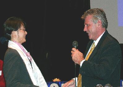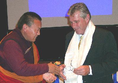 史蒂芬辛先生将哈达转送给一位他接触最久的法轮功学员,