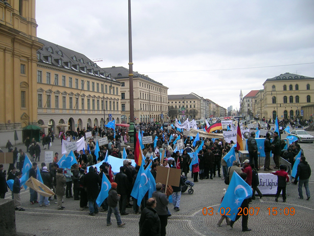 2月3日在德国慕尼黑市举行了大规模示威游行,德国的维吾尔组织成员及来自各地的上百名维吾尔人参加了此次示威游行,还有德国的一些组织,土耳其,伊斯兰组织及国际人权组织等近千名人加入了游行队伍。示威游行于2月3日下午一点半在慕尼黑市