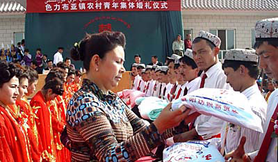 中共当局在东土耳其斯坦紧急实施的同化政策不仅仅局限于教育领域,还严重影响到维吾尔人民历来延续的传统风俗习惯。如,目前随着中共当局在东土耳其斯坦村庄转移大量维吾尔男女到中国内地打工,还在维吾尔年轻人当中普及中共式集体婚礼。据了解各级政府及团委强迫维吾尔年轻人胸前带着花
