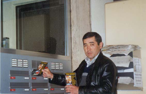 Trotz seiner eigenen Arbeit findet Herr Kadir Salim Zeit um die Broschüren,
