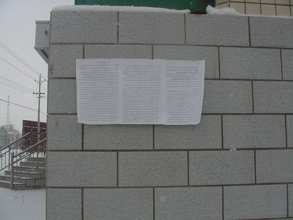 ウイグル民主党がグルジャ市電信局の壁に張った壁新聞