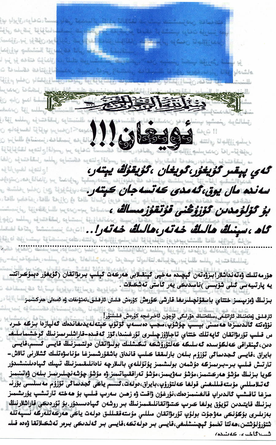 ウイグル民主党が発行したビラは,侵略者の中国当局が東トルキスタンで実行している消滅政策,行為などを公開、非難し,ウイグル人民は東トルキスタンに侵略してきた中国人を追い出し,これから東トルキスタンに来ようとしている中国人を防いで,東トルキスタン共和国の独立を回復させるために,内部の協力を強め,敵観点を明確し、東トルキスタンの各地に秘密裡に運動を展開させ,祖国の解放を一日も早く実現させるように呼びかけている。