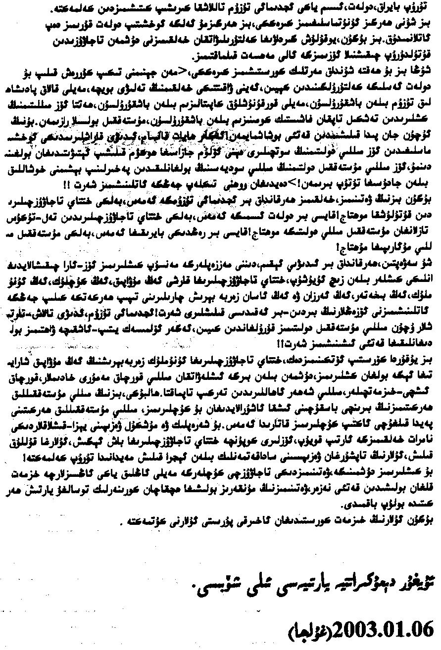 ウイグル民主党が決意し、東トルキスタンの全ての地区でこのような秘密宣伝活動をすると同時に、有力な小グループを組み,中国人侵略者を処罰し,彼らを追い出すなどの秘密運動を全面的に展開するよう希望する。