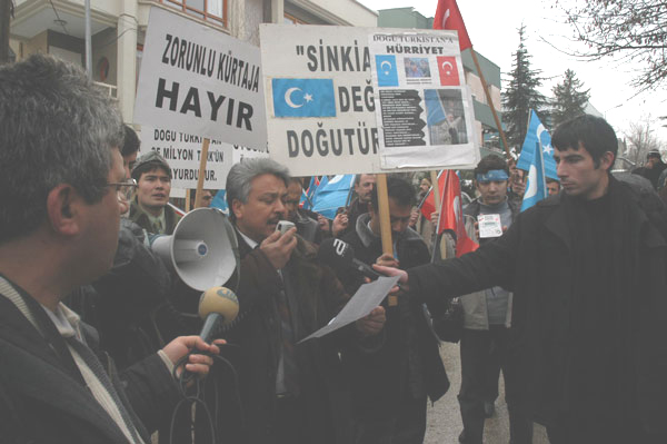 東トルキスタン文化協力協会アンカラ支部長のハイルッラ・エフェンディグリ(Hayrullah Egendigil)が中国大使館の前で、中国侵略者が東トルキスタンで行なっている国家テロ政策を批判する講演を行なった。グルジャ事件の後中国侵略者はイリ、タルバガタイ、アルタイ地区で計6万1千人のウイグル人を逮捕し、1500回も裁判会を開き、8000人以上を死刑に、他の5万人以上を無期懲役にしたのだ。