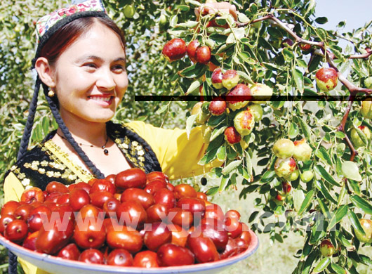 Töwendiki resimde, Cherchen nahiyesining aral yézisidiki Uyghur qizi béghida