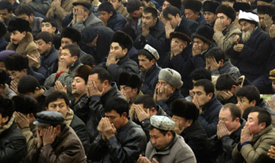 kelgen Uyghur muslumanliri bilen tolup – tashqan bolup, namazdin kéyin